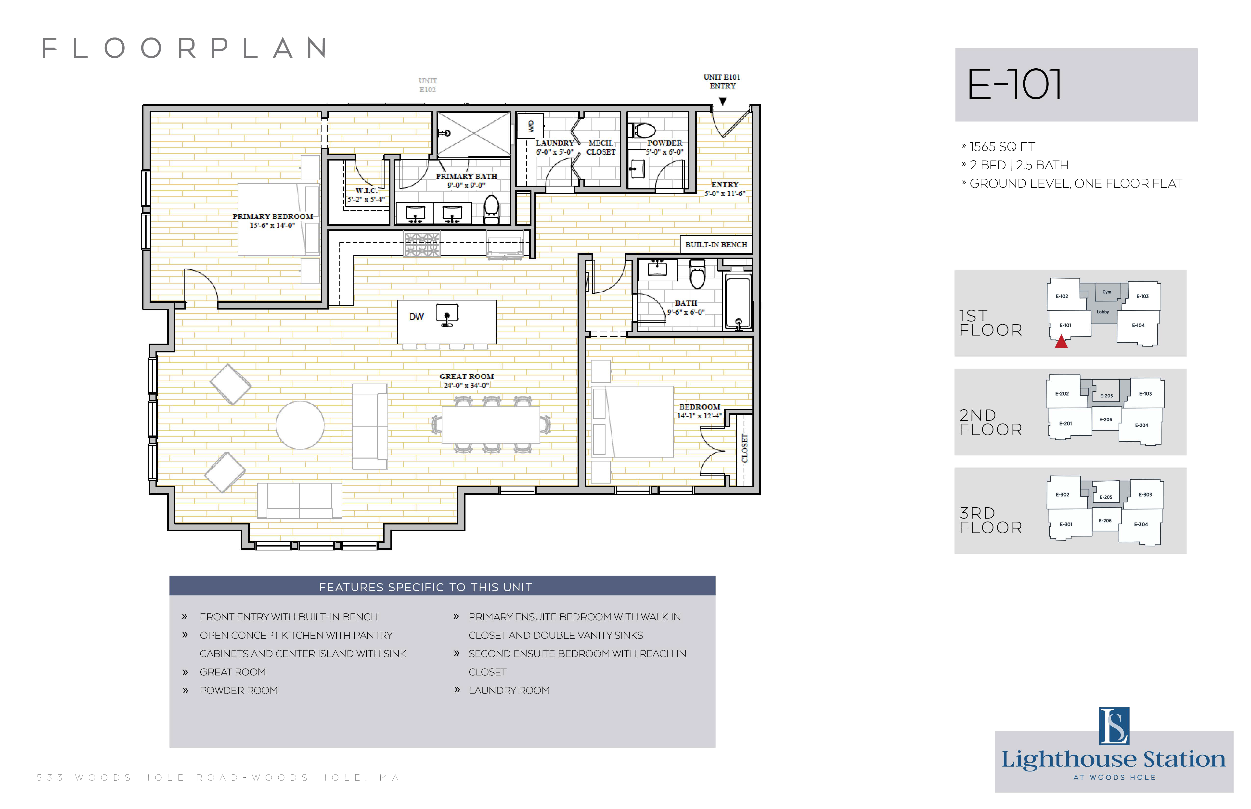 | E-101 | 2 Bed, 2.5 Bath | 1565 SQFT | 1st Level | 1 Floor | |