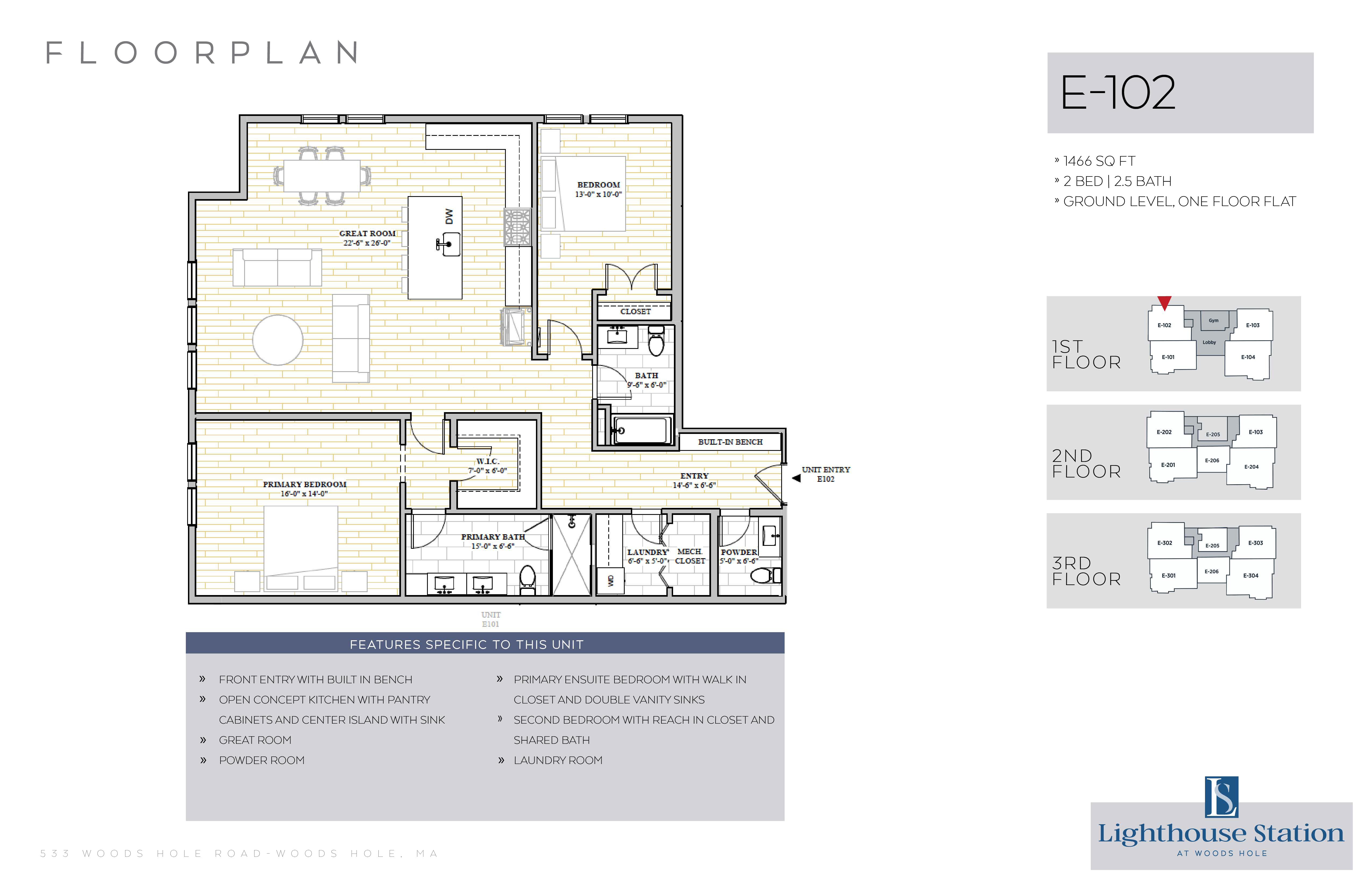 | E-102 | 2 Bed, 2.5 Bath | 1466 SQFT | 1st Level | 1 Floor | |