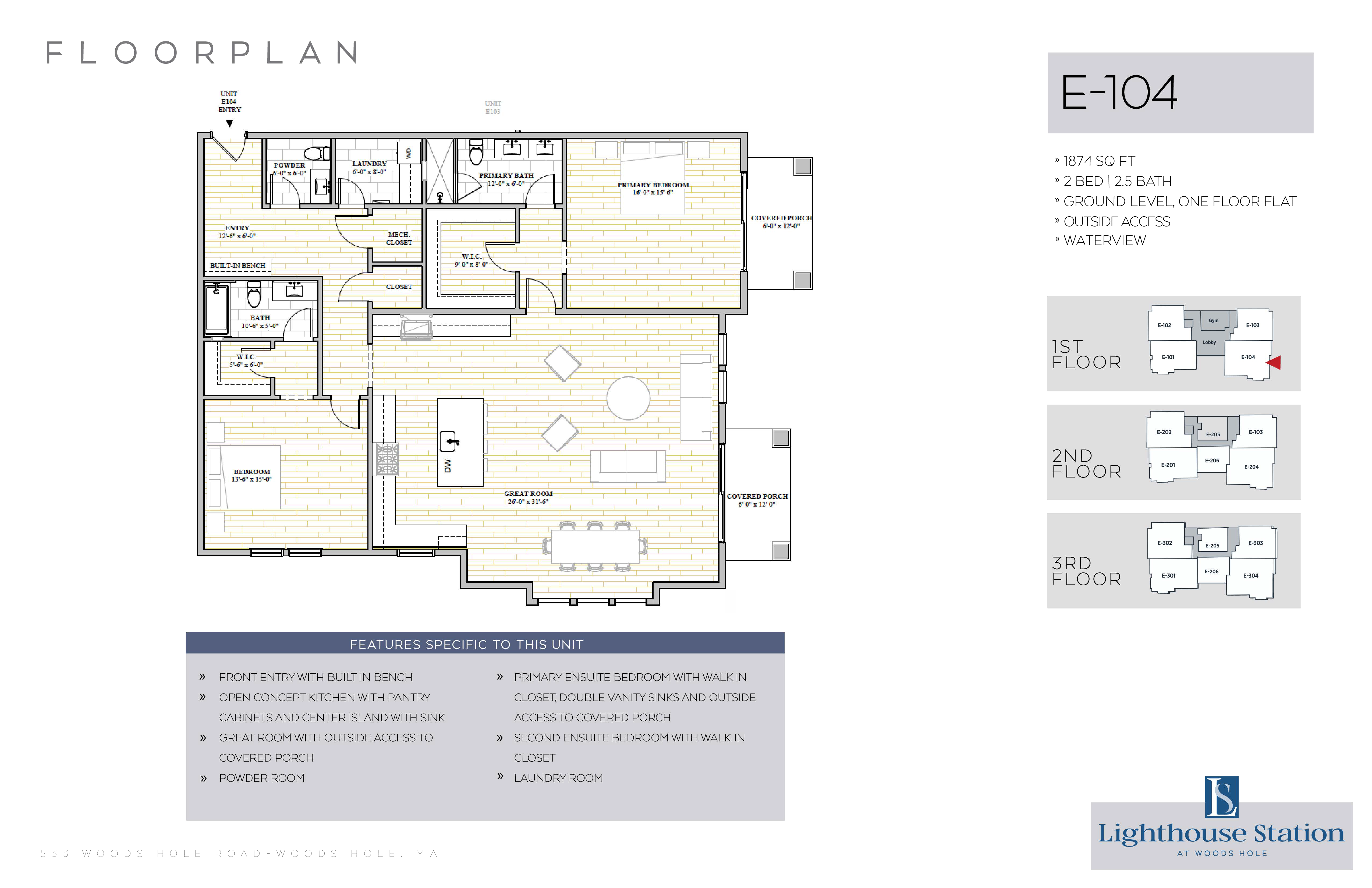| E-104 | 2 Bed, 2.5 Bath | 1874 SQFT | 1st Level | 1 Floor | |