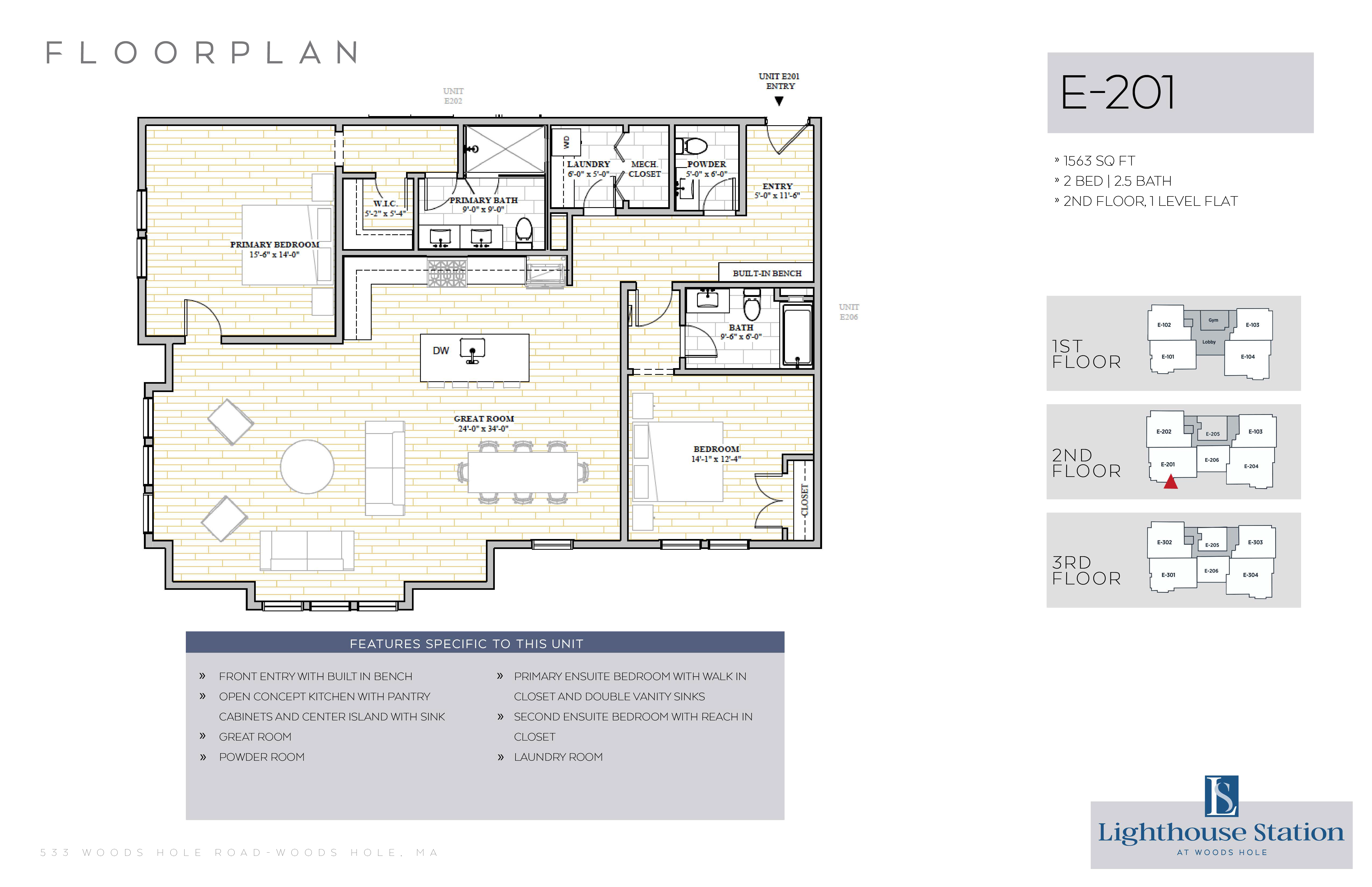 | E-201 | 2 Bed, 2.5 Bath | 1563 SQFT | 2nd Level | 1 Floor | |