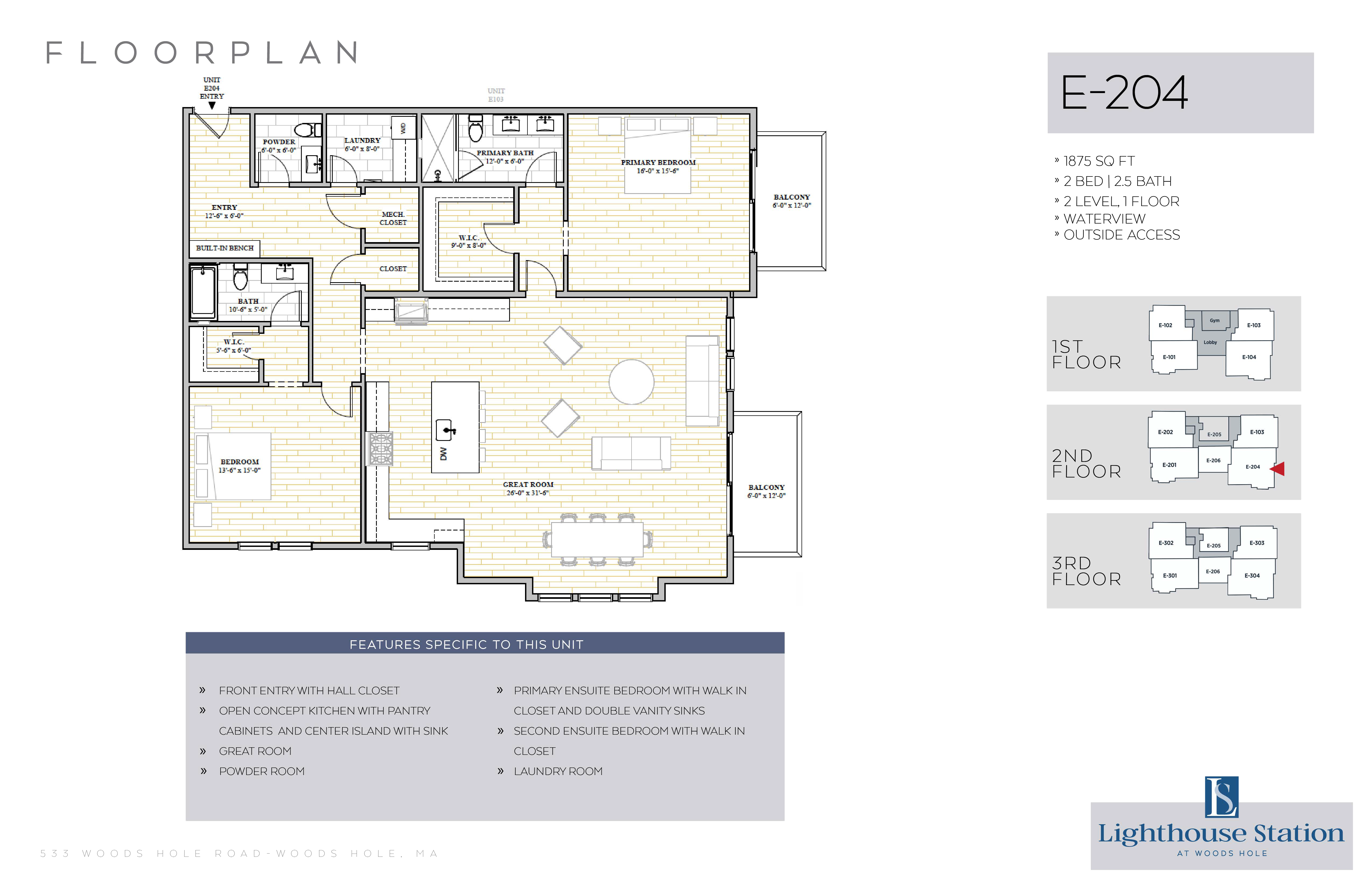 | E-204 | 2 Bed, 2.5 Bath | 1875 SQFT | 2nd Level | 1 Floor | |
