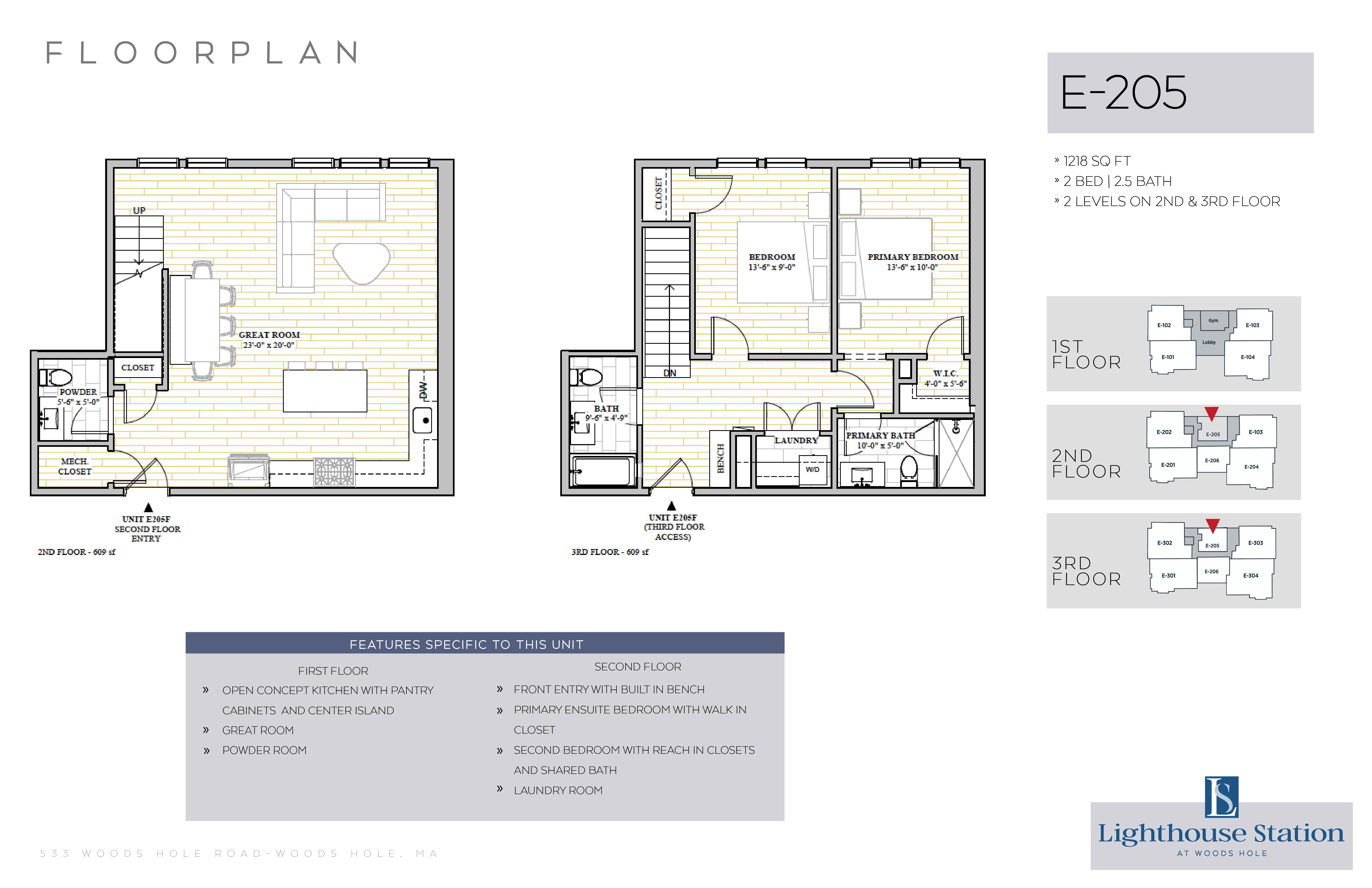 | E-205 | 2 Bed, 2.5 Bath | 1218 SQFT | 2nd & 3rd Level | 2 Floors | |
