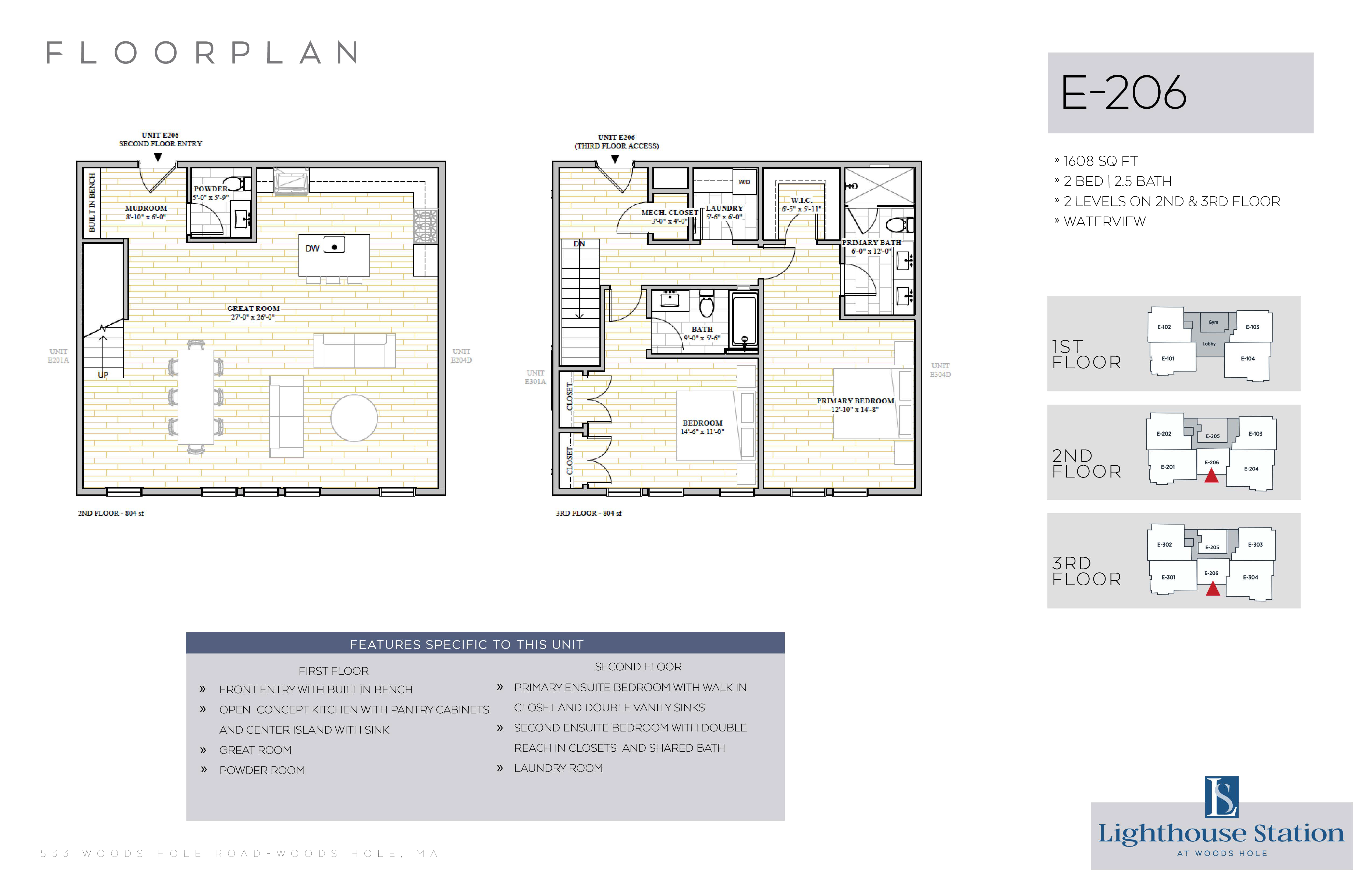 | E-206 | 2 Bed, 2.5 Bath | 1608 SQFT | 2nd & 3rd Levels | 2 Floors | |