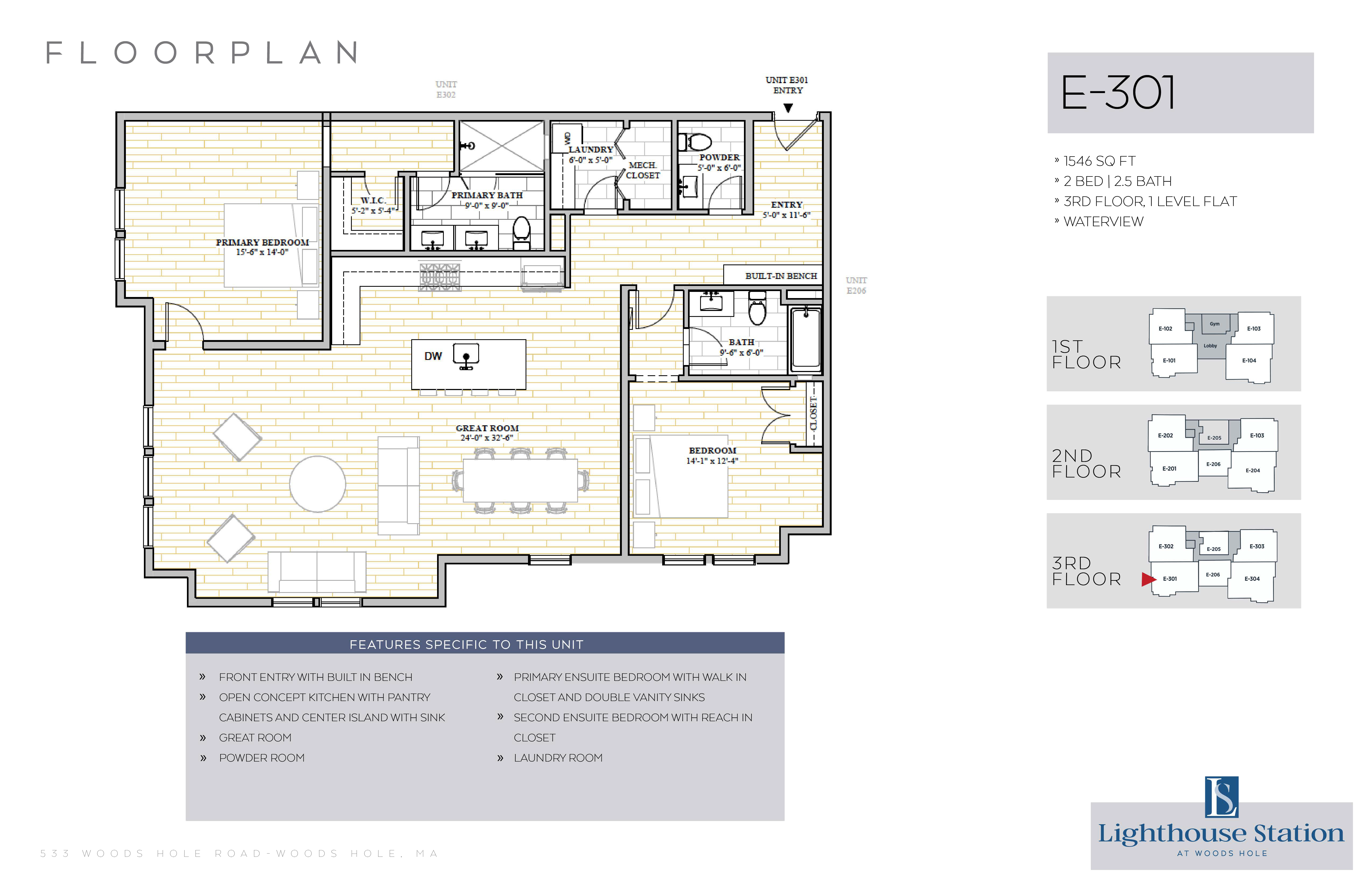 | E-301 | 2 Bed, 2.5 Bath | 1546 SQFT | 3rd Level | 1 Floor | |
