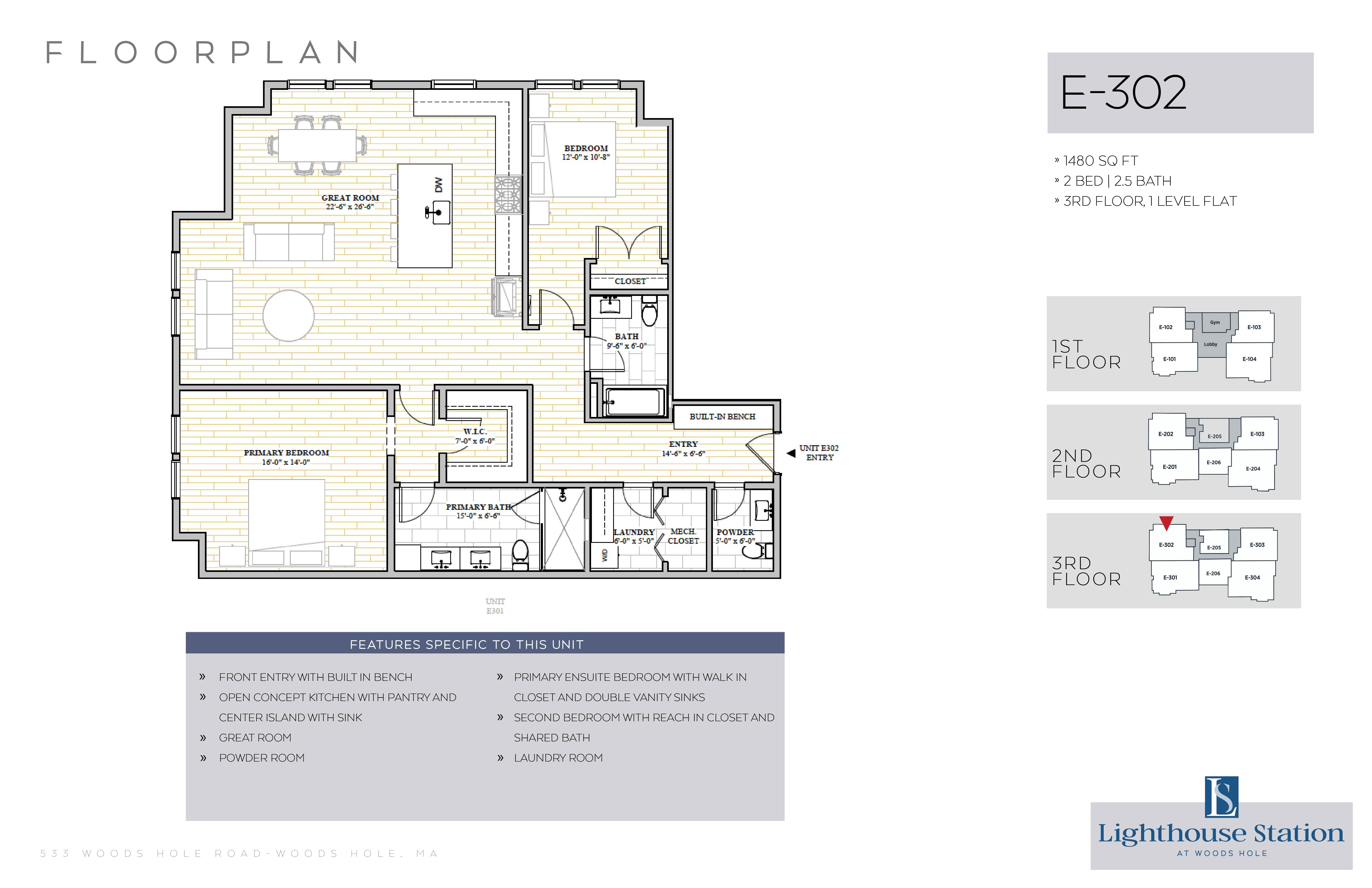 | E-302 | 2 Bed, 2.5 Bath | 1480 SQFT | 3rd Level | 1 Floor | |