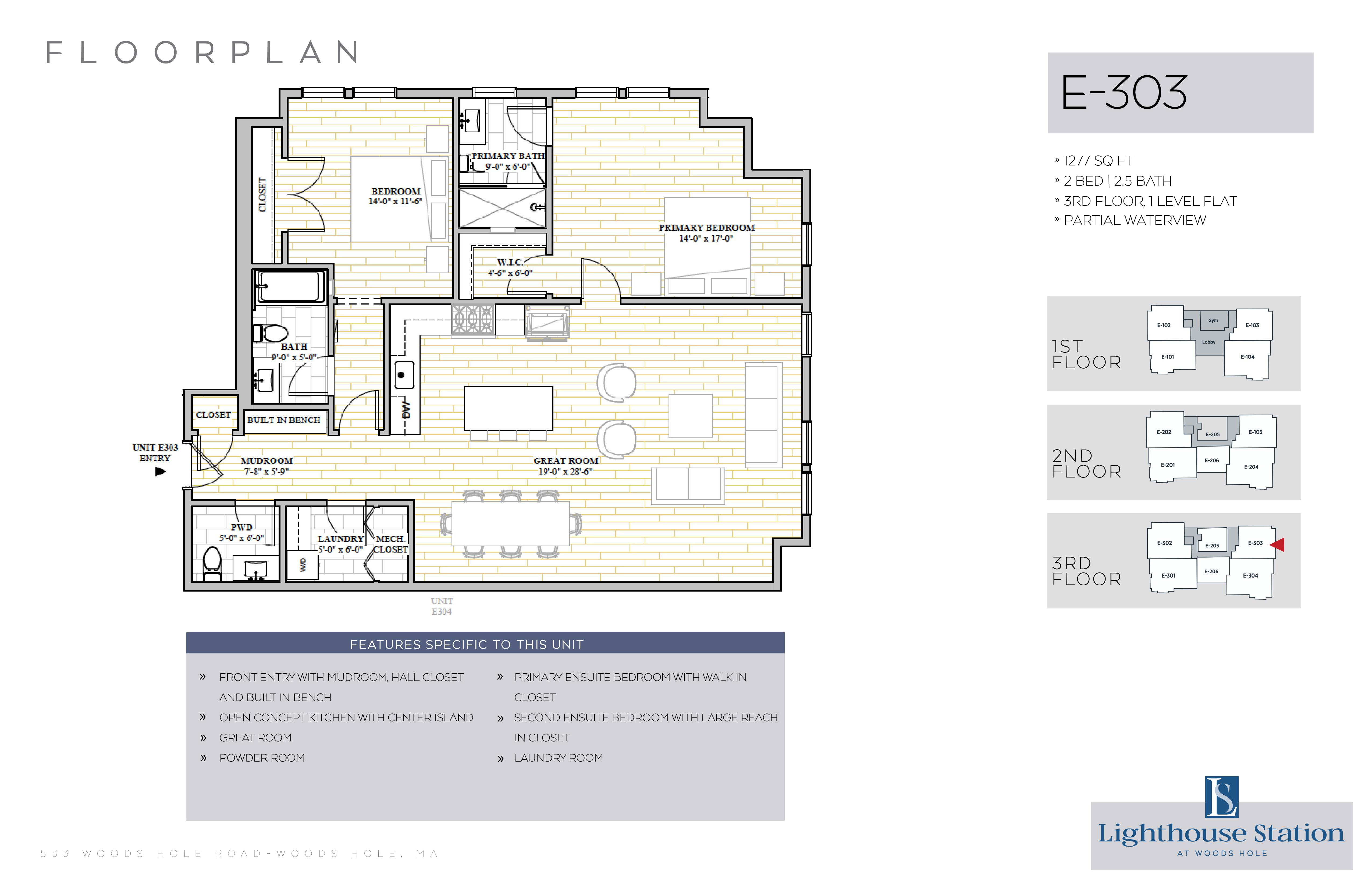 | E-303 | 2 Bed, 2.5 Bath | 1277 SQFT | 3rd Level | 1 Floor | |