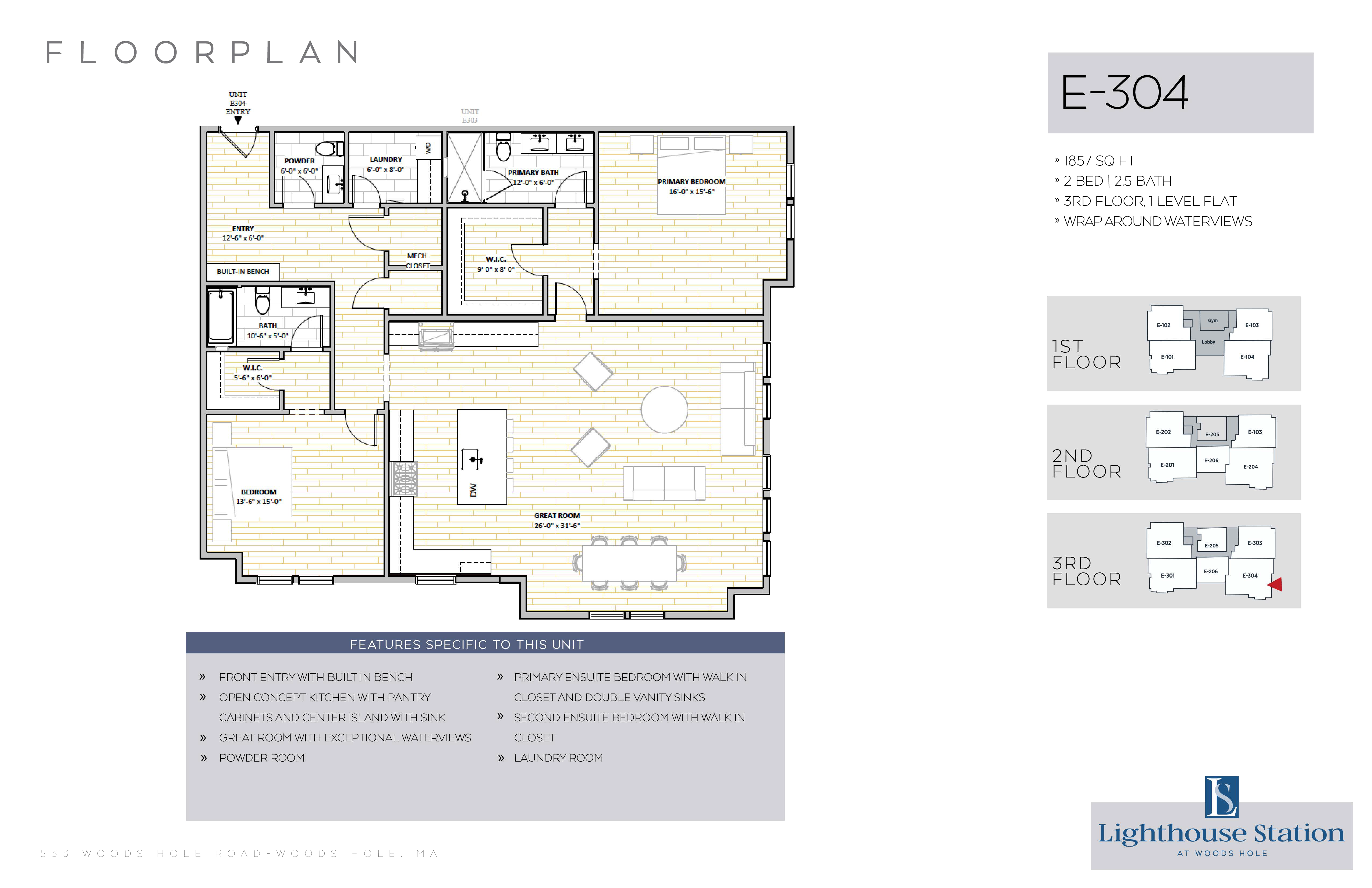 | E-304 | 2 Bed, 2.5 Bath | 1857 SQFT | 3rd Level | 1 Floor |